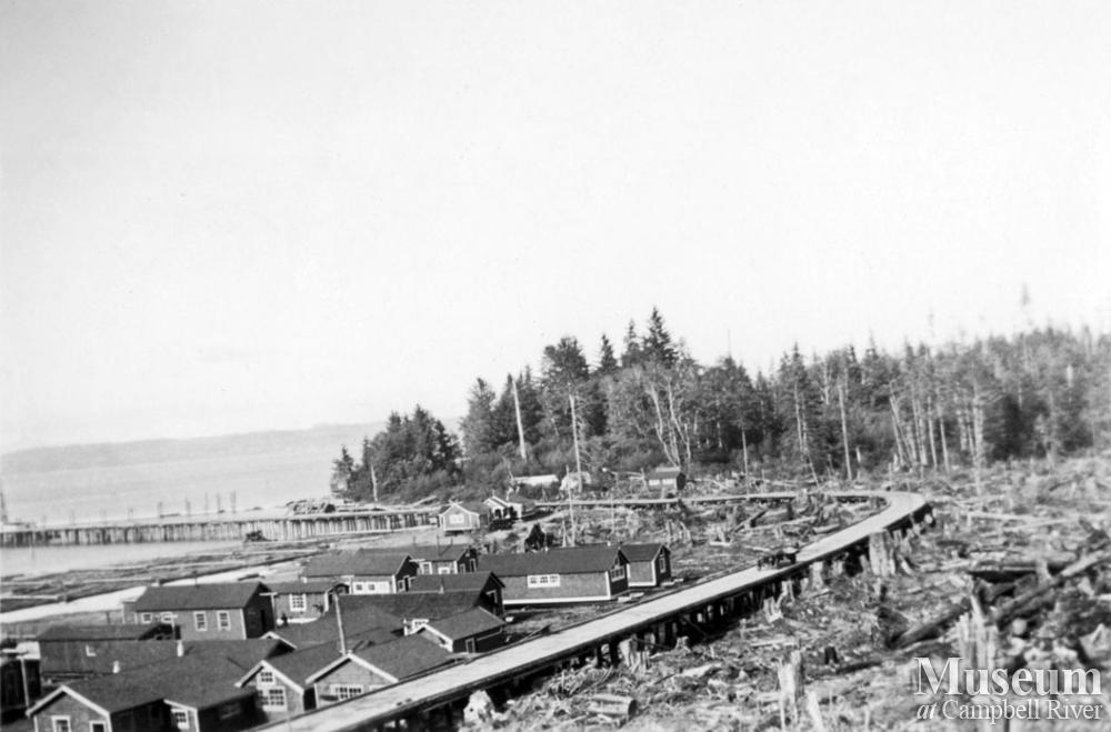 View of the logging camp buildings at Pioneer Timber Co. at their operations at Port McNeill. Note the wooden road this was a truck logging operation and the trucks drove on these wooden plank roads.