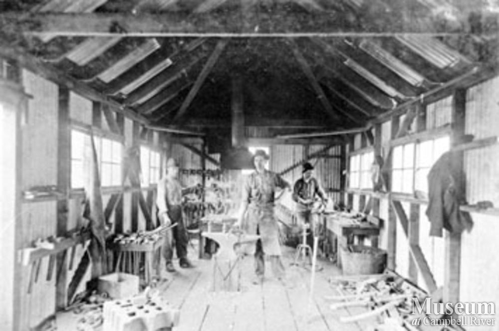 Interior of the blacksmith's shop at Powell River Co. operations at Kingcome Inlet.