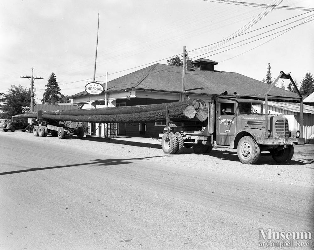 Joe Zanatta operated a trucking and sawmilling business in Campbell River. One of his Hayes Diesel truck parked outside his offices near the Quinsam Hotel.