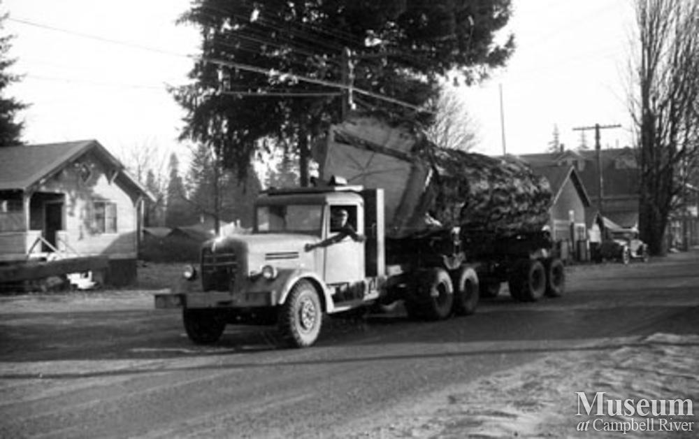 Joe Zanatta's truck hauls a large piece of timber on the Island Highway through Campbellton area.