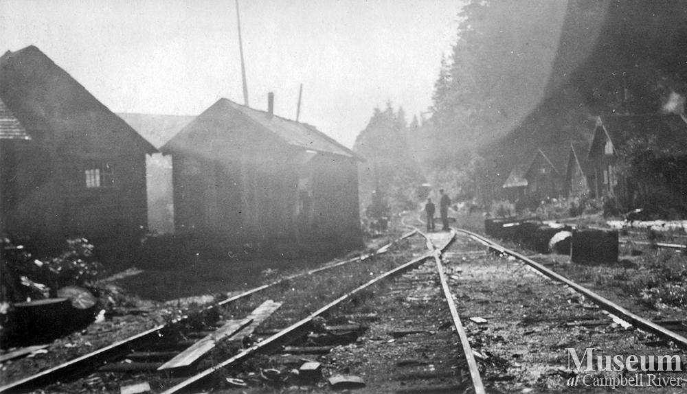Rail line and camp buildings at Elk Bay