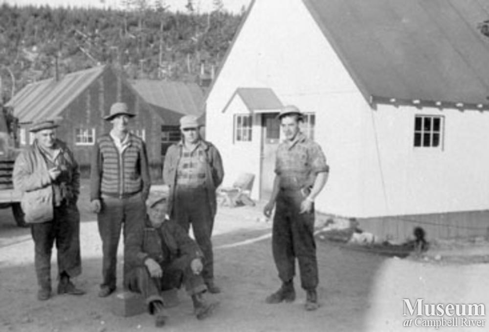 A reforestation camp in the Salmon River area (across high level bridge). White building in the background was the office. Clarence Woss, (Voss?), Sam McTurk, ??, Ralph Shadell, and Harry Ferguson.