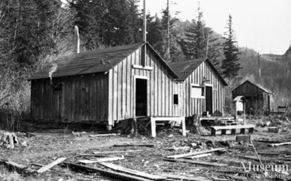 View of the old camp building prior to the remodelling for use by the planting crew. These buildings were originally part of P.B. Anderson logging camp at Knox Bay, Thurlow Island.
