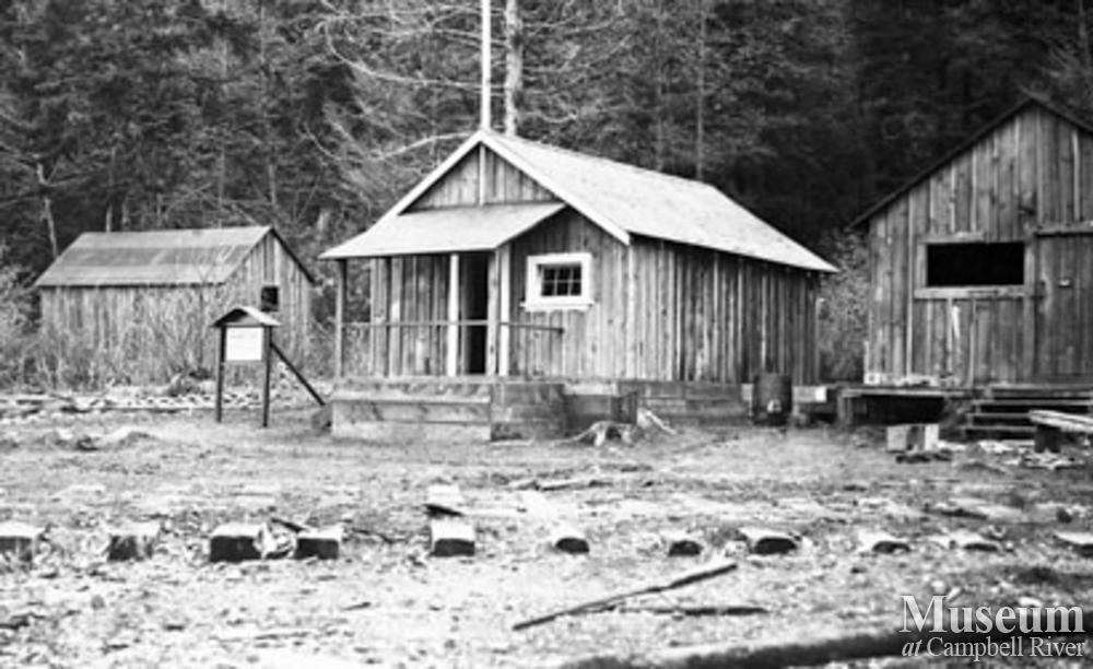 After being remodelled for use by the planting crew. The cabin faces south into the bay, and two rows of yellow pine and douglas fir were heeled in nearby.
