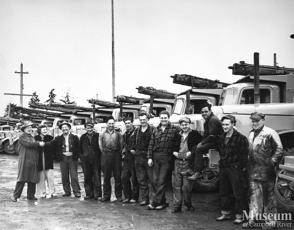 From left: Charlie and Ruth Chapple, proprietors of Fisherman's Lodge at Oyster River; Bill Schnare, owner of S and S Trucking; Al Friessen, top mechanic for S and S; ?; Joe Mitchell; Fred Clarke, assistant manager for S and S; Stan Schnare, manager for S and S; John Kirkland; Shorty McKinnley; Chuck Smyth; and Al Franzen. S and S stood for Schnare and Schnare - a father and son business which also hauled for the Elk River Timber Company.