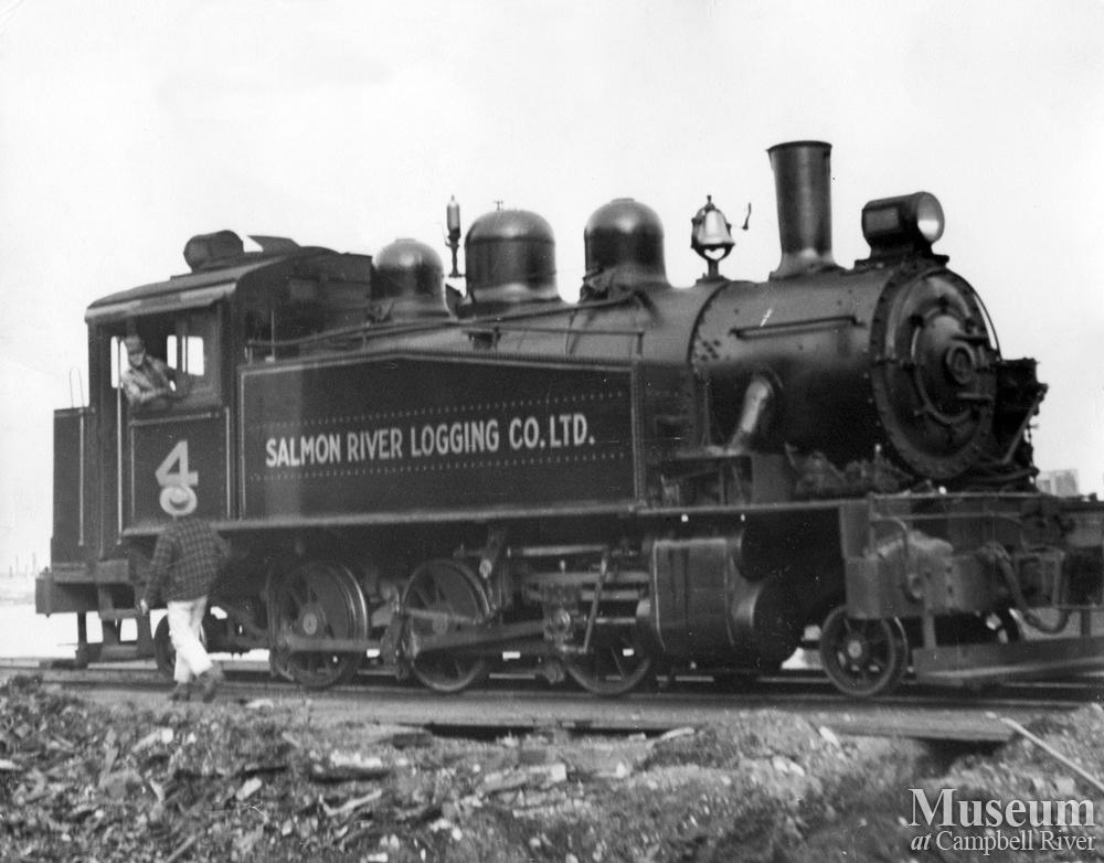 Salmon River Logging Co. locomotive #4 (a 2-6-2T Porter) at their operations in the Sayward area.