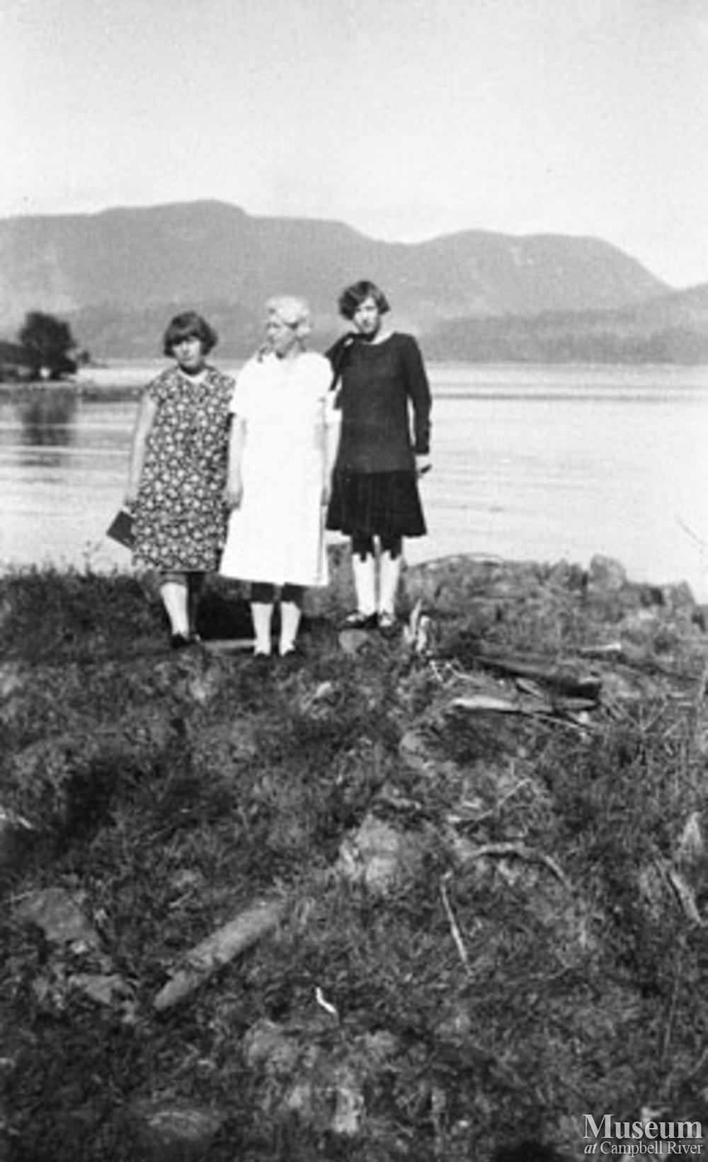 Mrs. Margaret Fielding and Helen Willman on the beach in front the logging camp at Elk Bay.