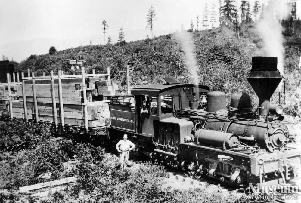 Engineer Dick Grandy with a Shay Lima Locomotive at Menzie's Bay.