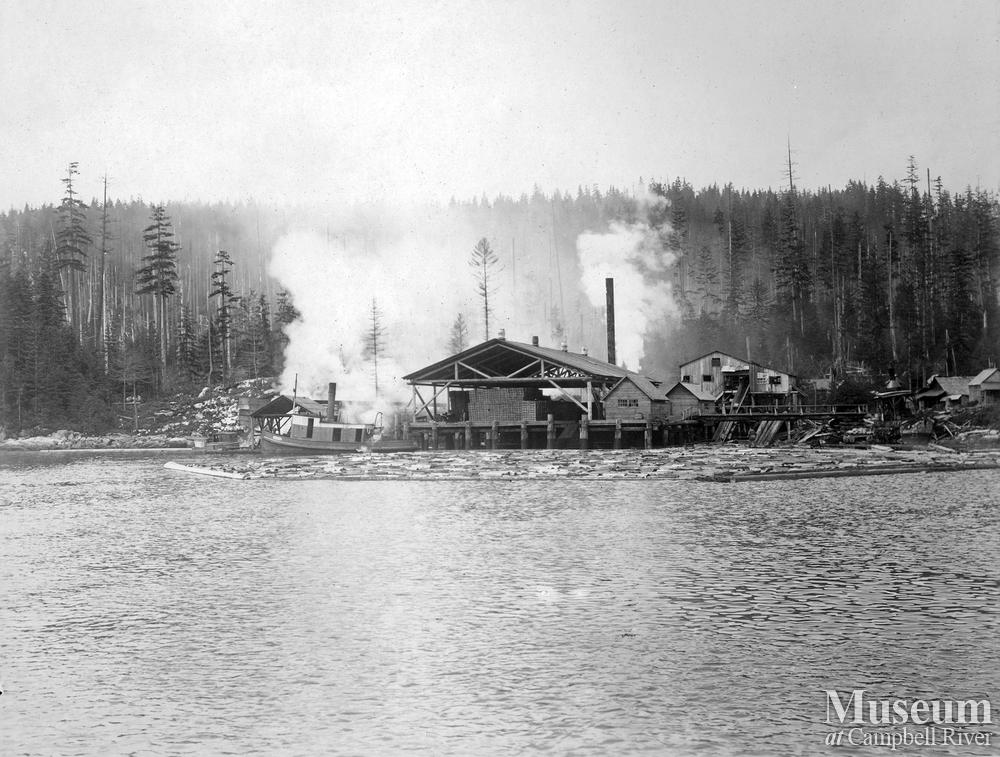 Shingle mill of A.P. Allison and Co. (Vancouver) opposite Green Point Rapids as the Kalmor II aunch passes the mill.