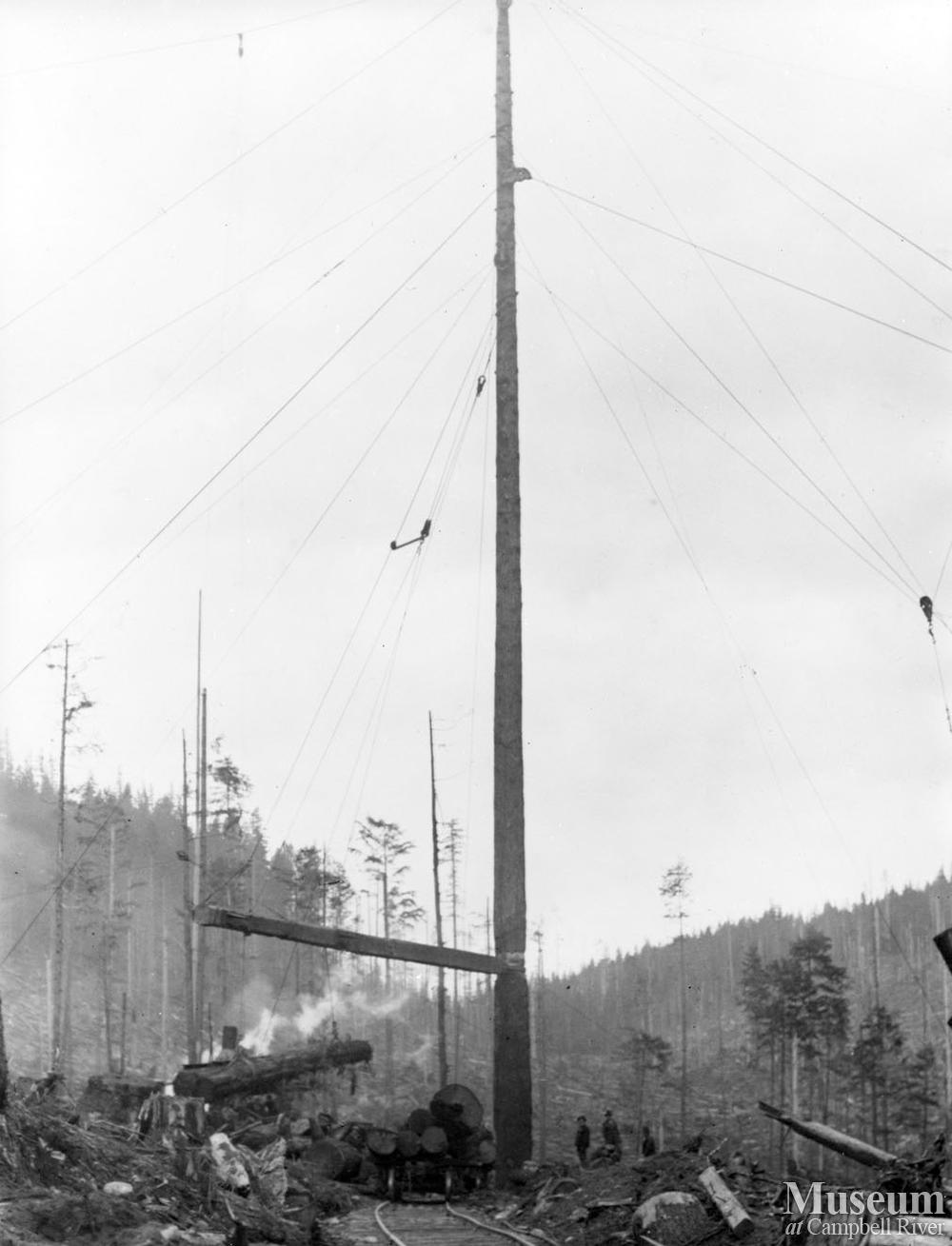Information from back of photograph: This spar tree was one of two used in this operation. Note the mainline (a cable of perhaps 2 1/4 inches) and the carriage for transporting logs from one spar tree to the other (about 2000 feet away). The carriage would be moved by a donkey engine from tree to tree, drop logs into a pile, and a loading boom with tongs would be used to lift the logs onto the train.