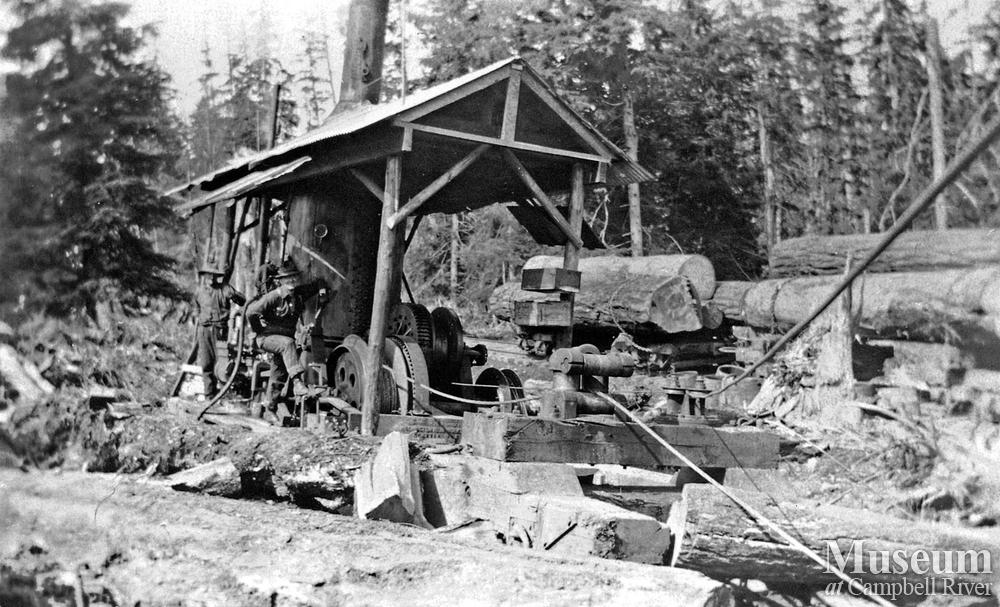 Steam donkey in operation likely on Quadra Island
