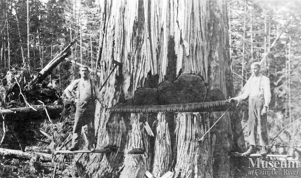 Bill Edman and Oscar Sunbeck falling a cedar.