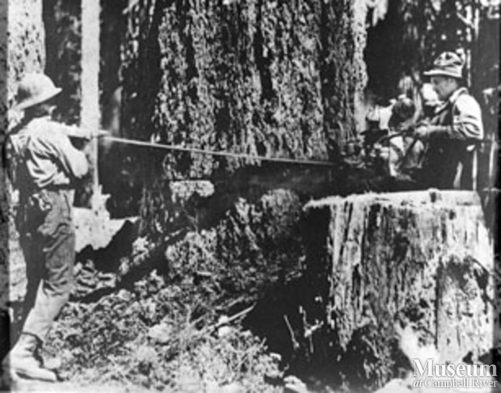 Head faller Norm Gray and an unknown sawman use a two-man chainsaw.