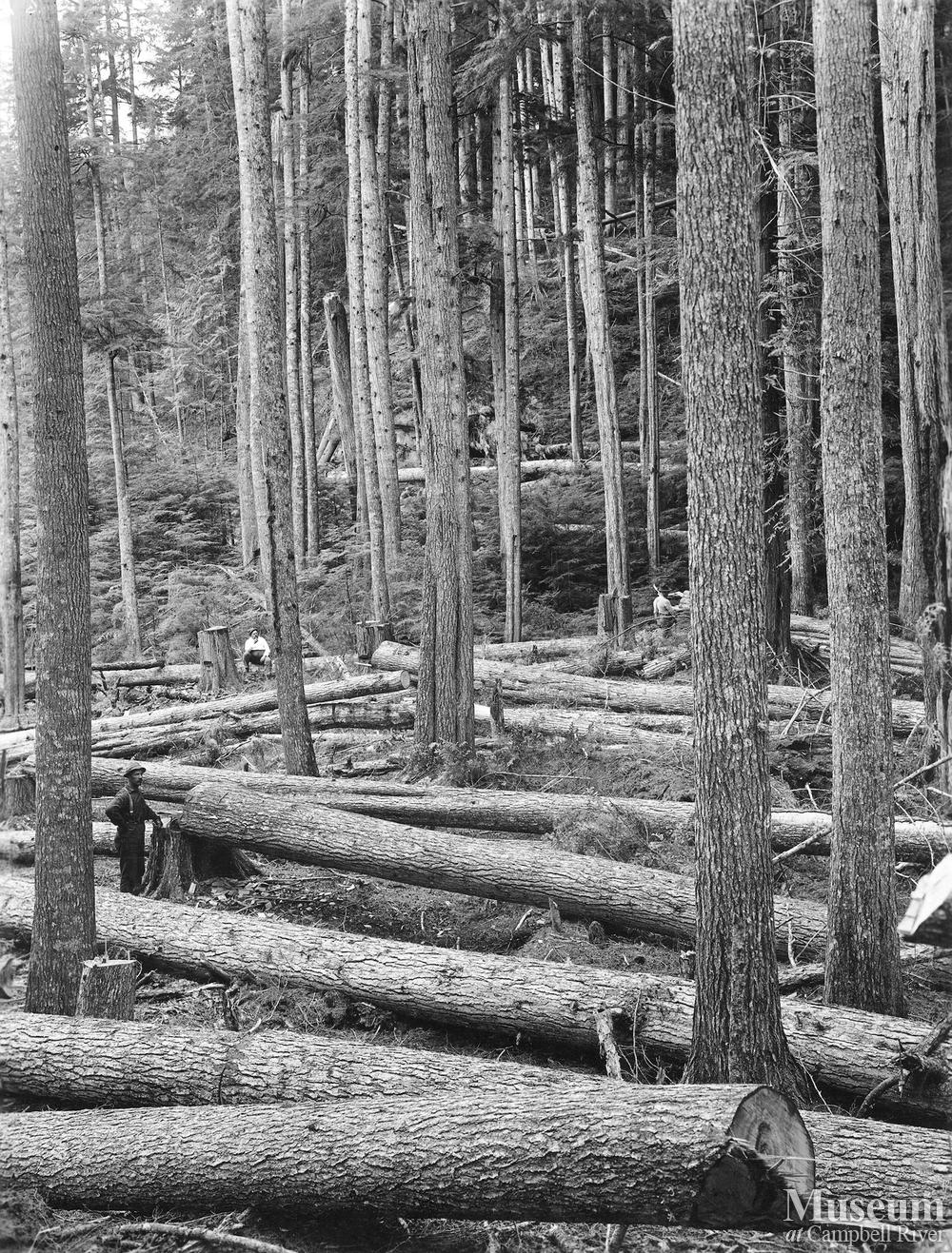 After falling and bucking, with uncut timber in the background ranging from 16 to 36 inches in diameter. Located on Booker Lagoon, Broughton Island, B.C., Surveyed Timber Limit 8890, at an elevation of 100 feet.