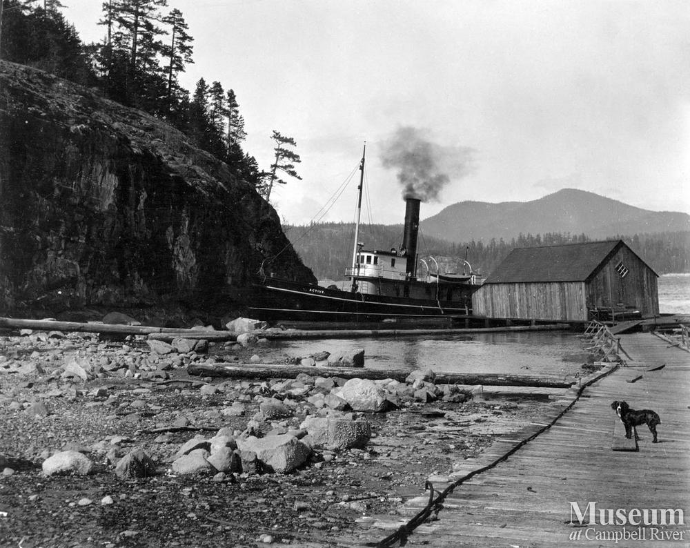 The tugboat 'Active' tided up at end of Rock Bay wharf.
