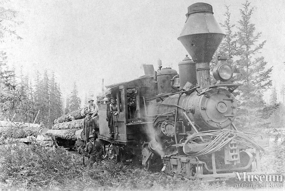 The 'Climax' locomotive of Wilson and Brady logging operations on Quadra Island. The engine in this model was a wood burner. Herbert Joyce is the second man in the cab door.