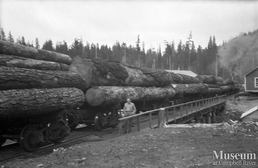 Rail cars loaded down with timber at Wood and English at Nimpkish operations.