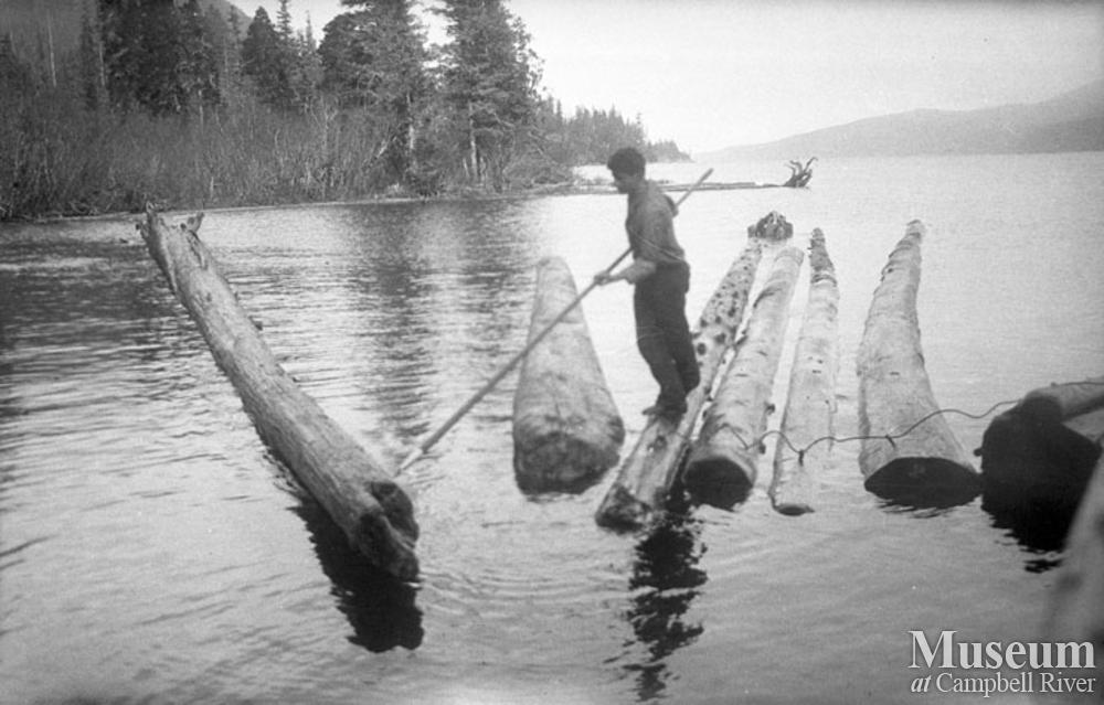 This photograph was likely taken when Roderick Haig-Brown, along with Ed and Buster Lansdowne spent the summer beachcombing logs from the Nimpkish Lake. The logs that they collected had escaped when being floated to the railhead.