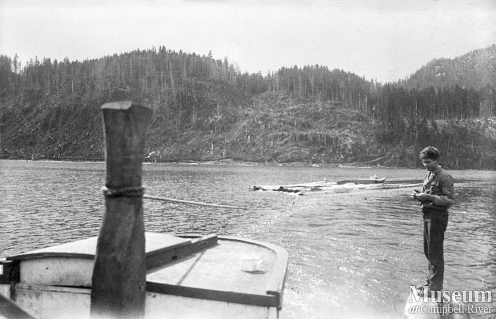 Boom of logs being towed by the 'Kathleen'. This photograph was likely taken when Roderick Haig-Brown, along with Ed and Buster Lansdowne spent the summer beachcombing logs from the Nimpkish Lake. The logs that they collected had escaped when being floated to the railhead.